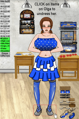 There are also 11 casino mini-games to play against Olga (3 Dice Hi-Low, 3 Card Hi-Low, Craps, Black Jack, 3 Card Poker, 3 Dice Poker (Yahtzee), Roulette, Strip Wheel, Risk, War and 'Rock Paper Scissor Lizard Spock'). If you win a mini-game you can strip Olga of a clothing item or put on a cuff or put on a bondage toy. If you lose, Olga puts on a clothing item or removes a bondage toy. Once you win or lose a mini-game against Olga, you can continue playing that mini-game or switch to another mini-game or stop playing mini-games. You may also strip her and bind her without playing a mini-game.